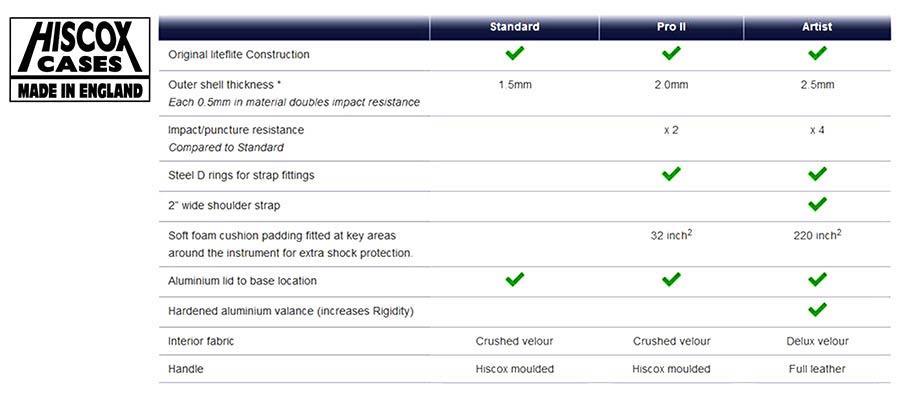 The Hiscox Standard series has been upgraded in 2022 by increasing the ABS shell thickness from 1.5mm to 2mm. This is the same shell material as used for the PRO II series and doubles the impact/puncture resistance. The updated Standard series cases are still lightweight and easy to transport, with even better protection and a (crushed) velvet lining.